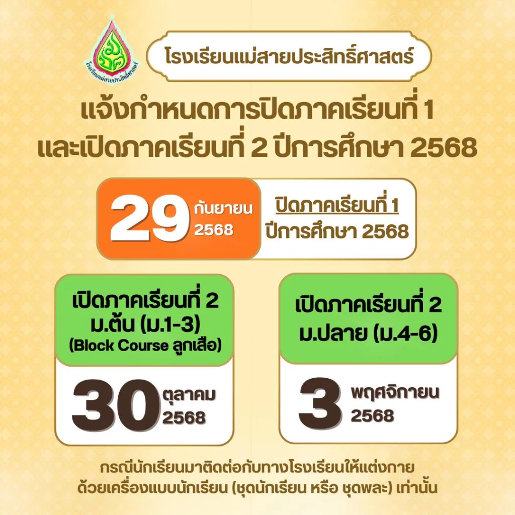 แจ้งกำหนดการปิดภาคเรียนที่ 1และเปิดภาคเรียนที่ 2 ปีการศึกษา 2568