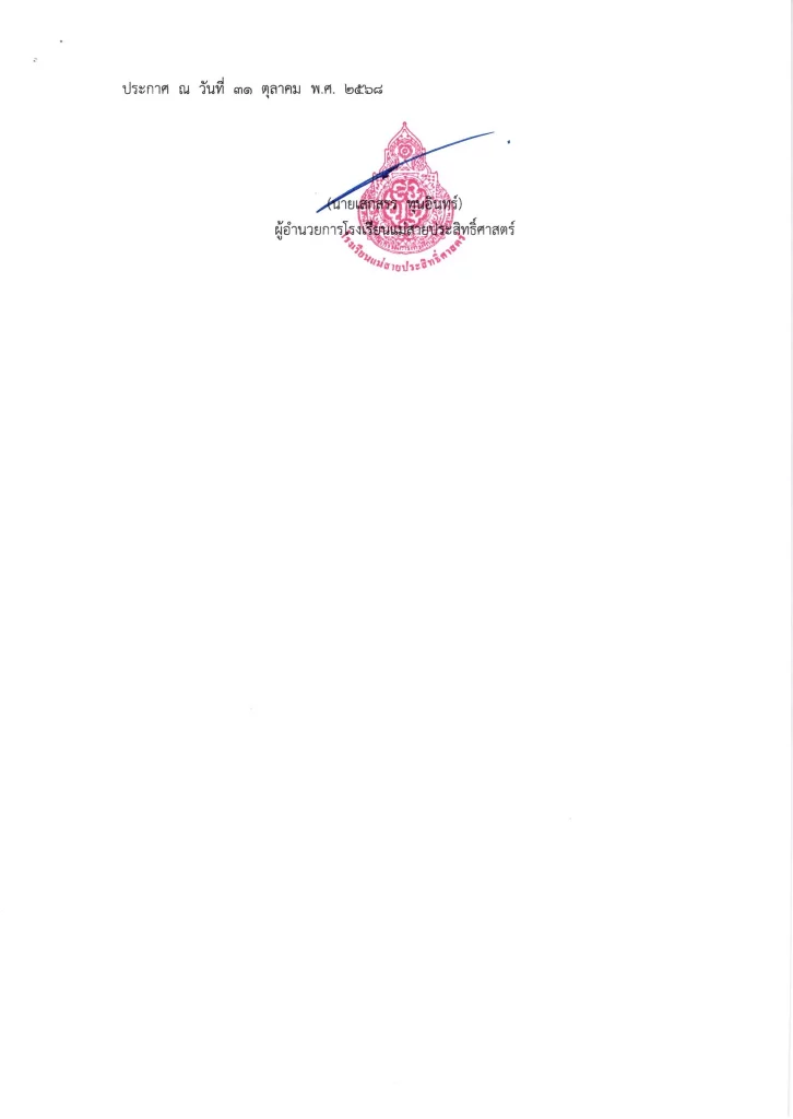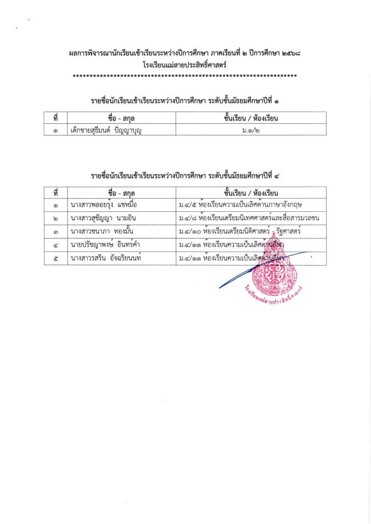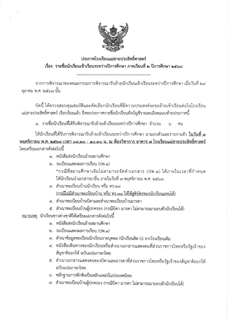ประกาศ เรื่อง รายชื่อนักเรียนเข้าเรียนระหว่างปีการศึกษา ภาคเรียนที่ 2 ปีการศึกษา 2568