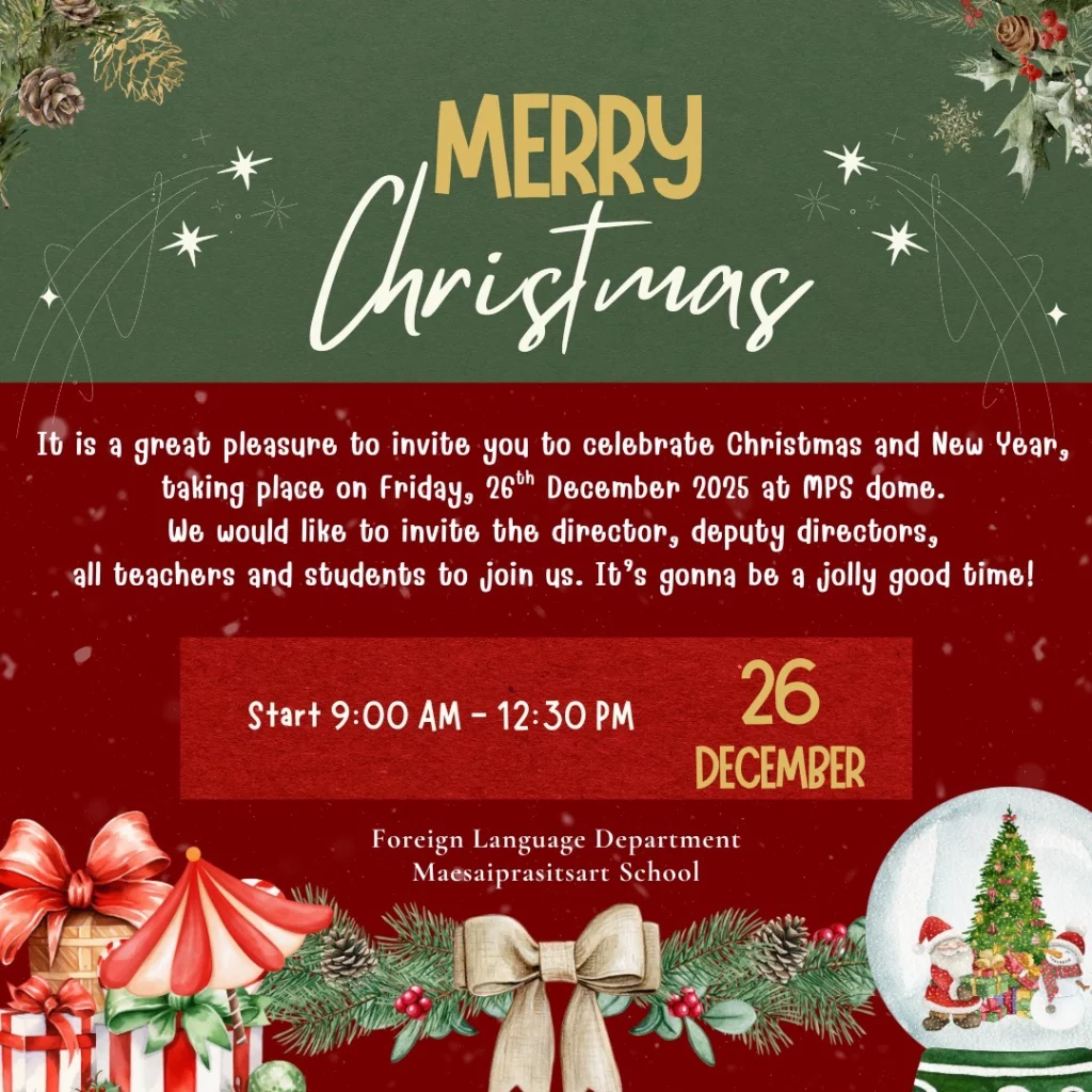 ขอเชิญชวนคณะครูและนักเรียนทุกคน เข้าร่วมกิจกรรมพัฒนาทักษะทางภาษาในวันคริสต์มาสและวันขึ้นปีใหม่ ประจำปีการศึกษา 2568 (Christmas Day and Happy New Year 2025)