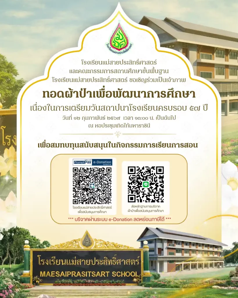 โรงเรียนแม่สายประสิทธิ์ศาสตร์ ร่วมกับ คณะกรรมการสถานศึกษาขั้นพื้นฐาน ขอเชิญชวนศิษย์เก่า ผู้ปกครอง และผู้มีจิตศรัทธาทุกท่าน ร่วมเป็นเจ้าภาพทำบุญ “ทอดผ้าป่าเพื่อพัฒนาการศึกษา” เนื่องในโอกาสการเตรียมงานวันสถาปนาโรงเรียนครบรอบ 57 ปี