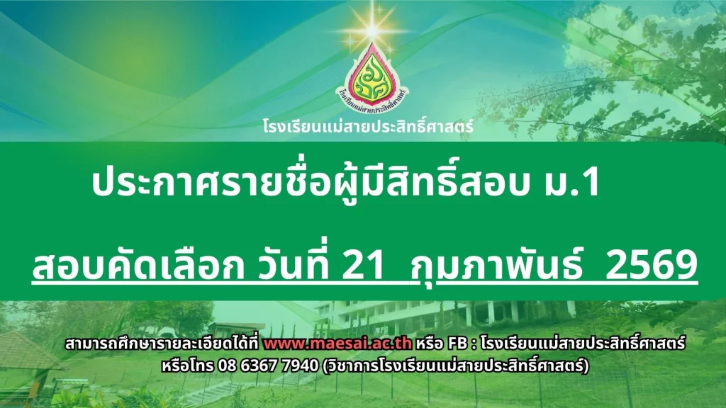 ประกาศ โรงเรียนแม่สายประสิทธิ์ศาสตร์ ขอเชิญร่วมเป็นเจ้าภาพทอดผ้าป่าเพื่อการศึกษา เนื่องในโอกาสครบรอบ 57 ปี ระดมทุนพัฒนาการเรียนการสอน03/02/202603/02/2026