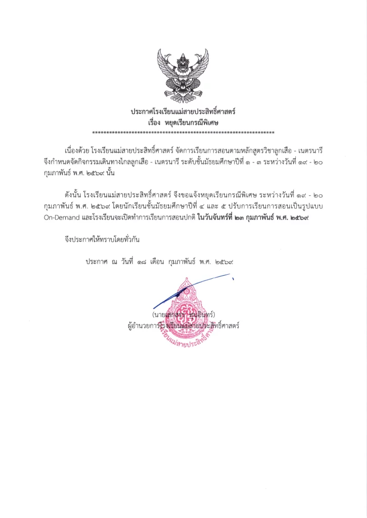 ประกาศ โรงเรียนแม่สายประสิทธิ์ศาสตร์ ประกาศรับสมัครนักเรียนใหม่ชั้น ม.1 และ ม.4 ปีการศึกษา 256902/02/202602/02/2026