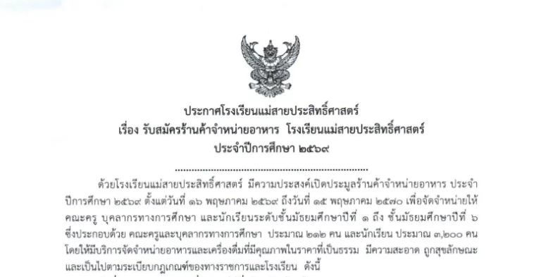 ประกาศ ประกาศโรงเรียนแม่สายประสิทธิ์ศาสตร์ เรื่อง รับสมัครร้านค้าจำหน่ายอาหาร ประจำปีการศึกษา 256902/03/202602/03/2026