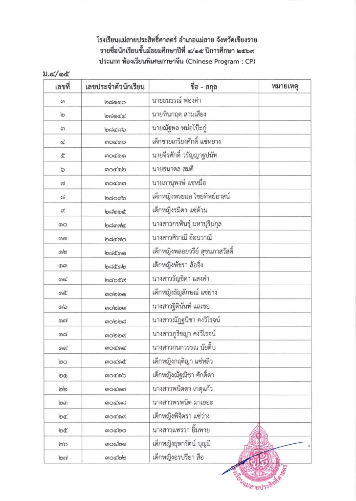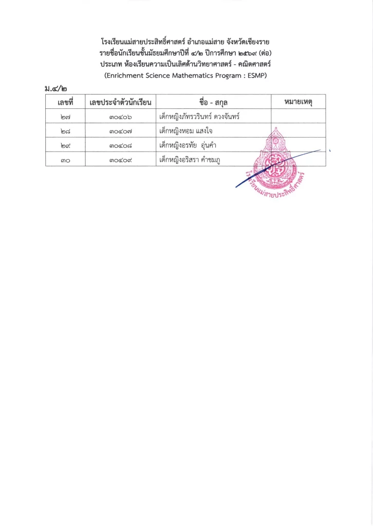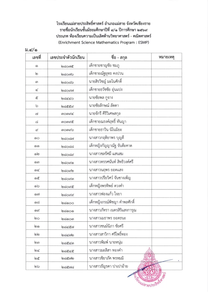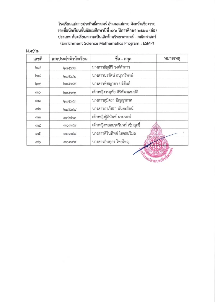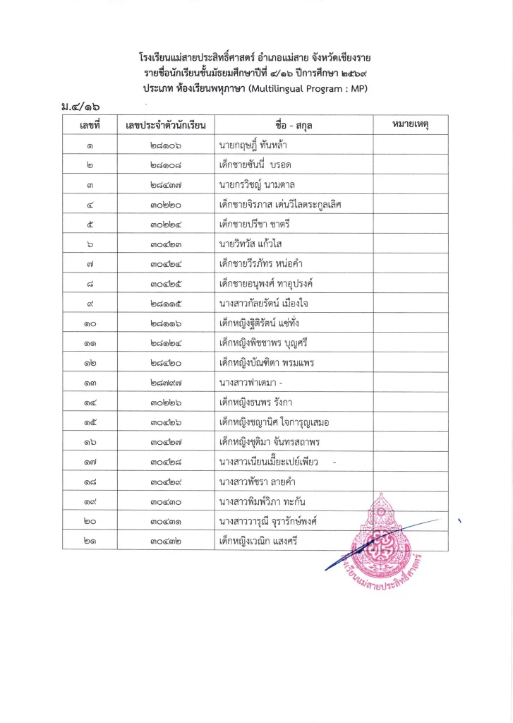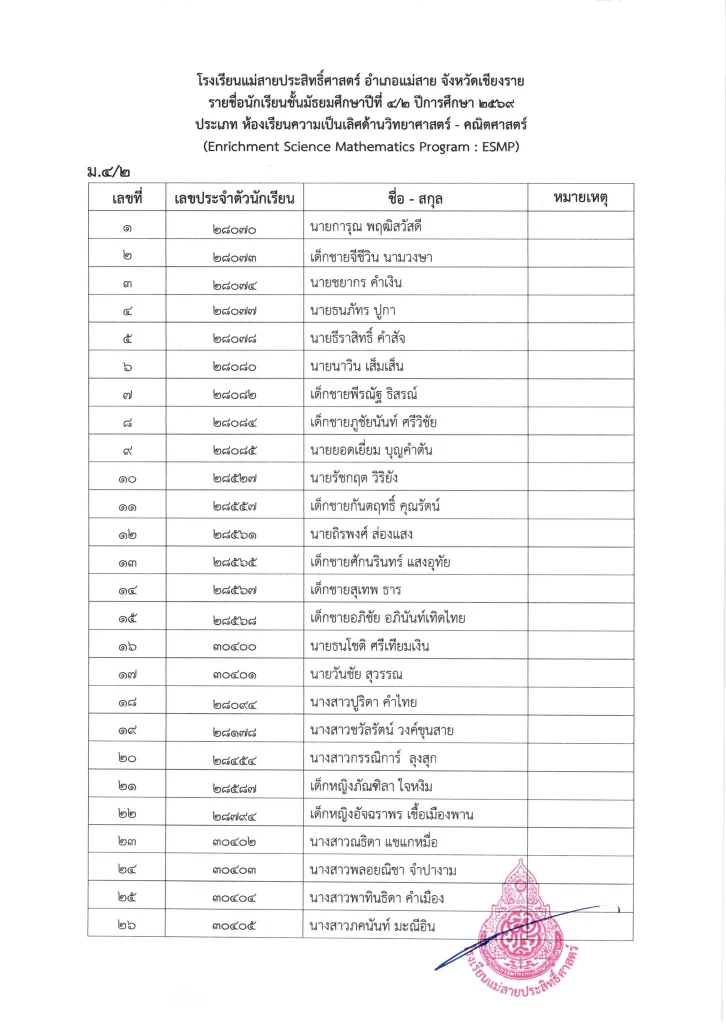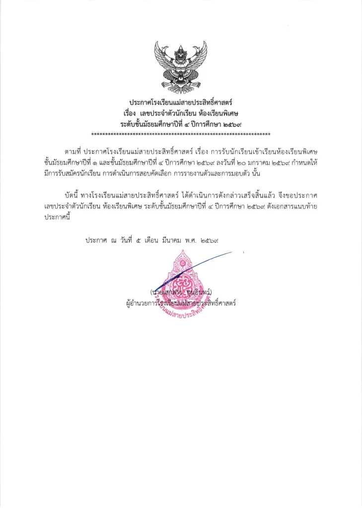 ประกาศ ประกาศ เรื่อง เลขประจำตัวนักเรียน ห้องเรียนพิเศษ ระดับชั้นมัธยมศึกษาปีที่ 1 ปีการศึกษา 256905/03/202605/03/2026