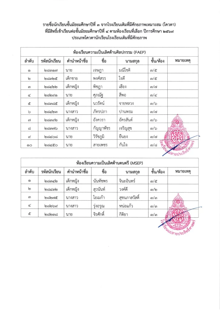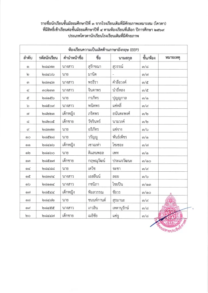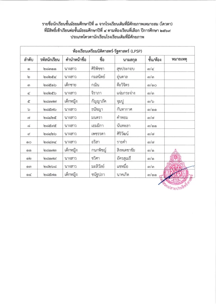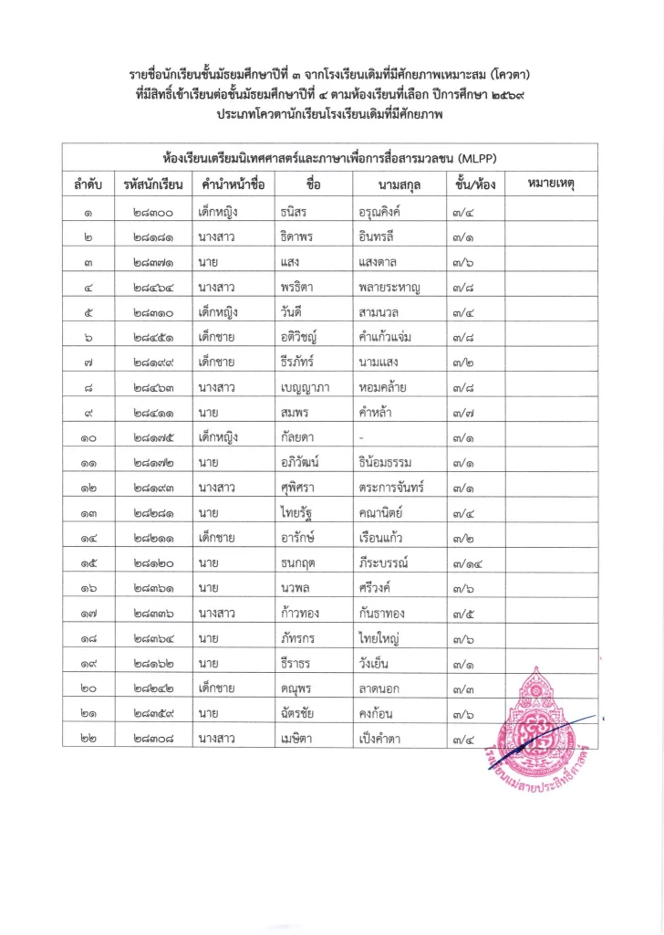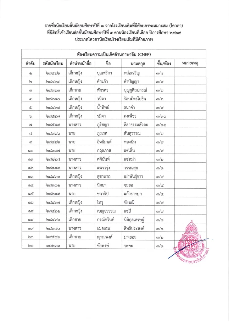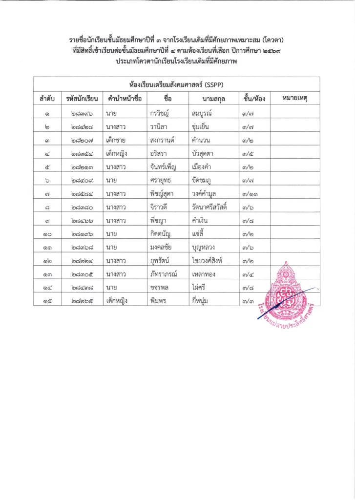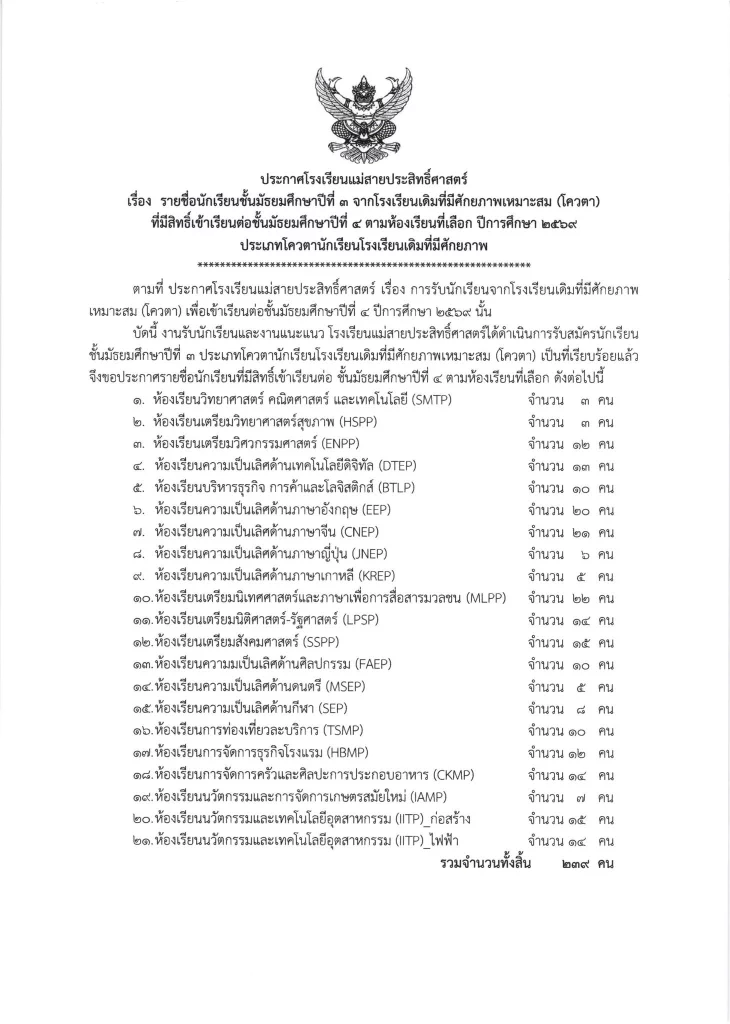 ประกาศ เรื่อง รายชื่อนักเรียนชั้นมัธยมศึกษาปีที่ 3 จากโรงเรียนเดิมที่มีศักยภาพเหมาะสม (โควตา) ที่มีสิทธิ์เข้าเรียนต่อชั้นมัธยมศึกษาปีที่ 4 ตามห้องเรียนที่เลือก ปีการศึกษา 2569