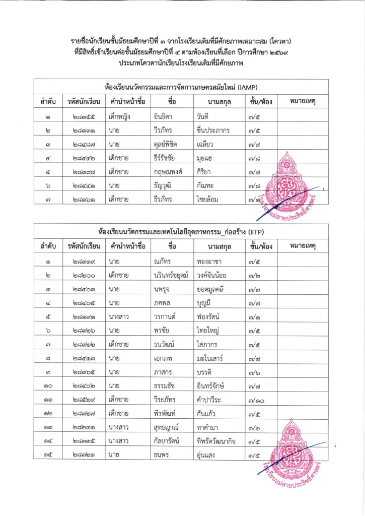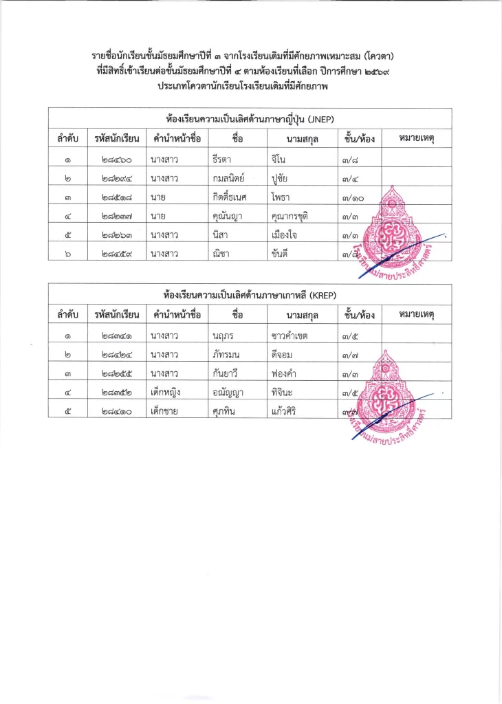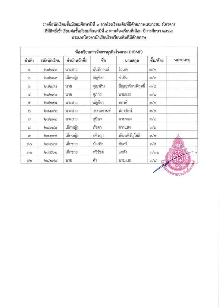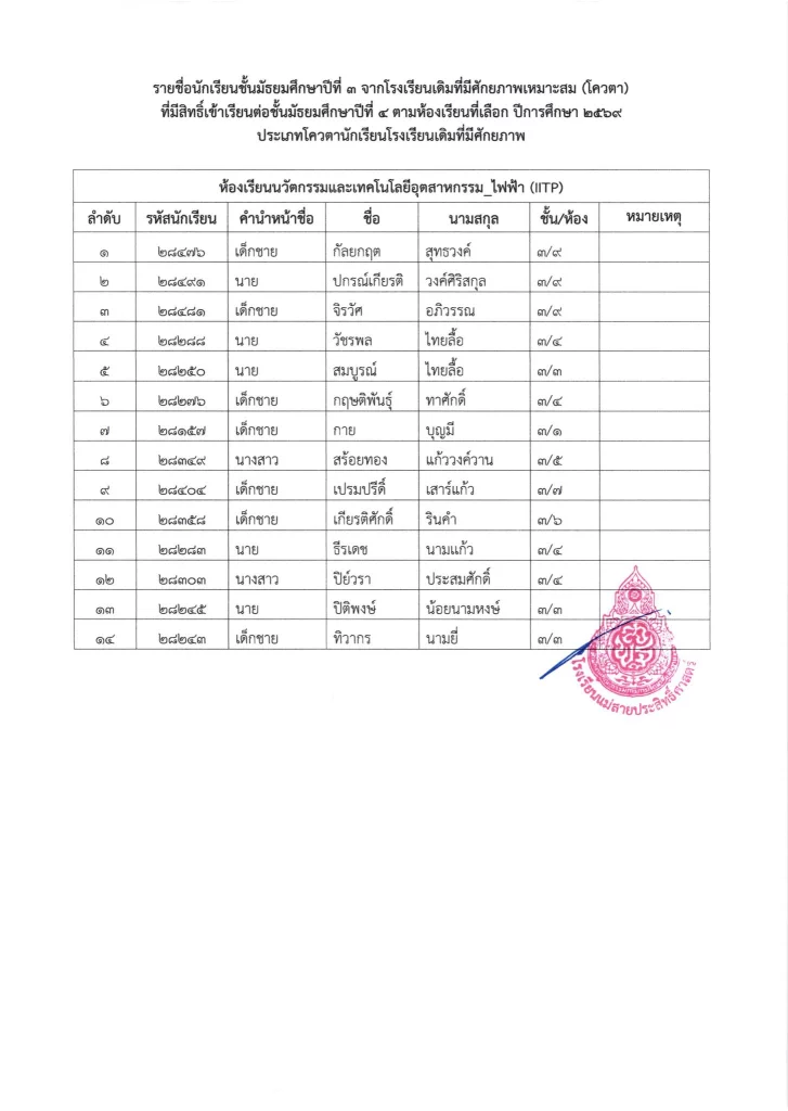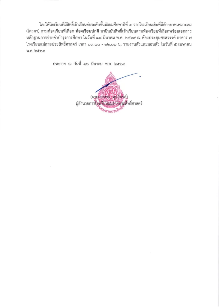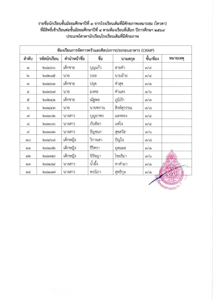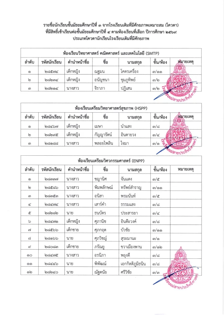 ประกาศ เรื่อง รายชื่อนักเรียนชั้นมัธยมศึกษาปีที่ 3 จากโรงเรียนเดิมที่มีศักยภาพเหมาะสม (โควตา) ที่มีสิทธิ์เข้าเรียนต่อชั้นมัธยมศึกษาปีที่ 4 ตามห้องเรียนที่เลือก ปีการศึกษา 2569