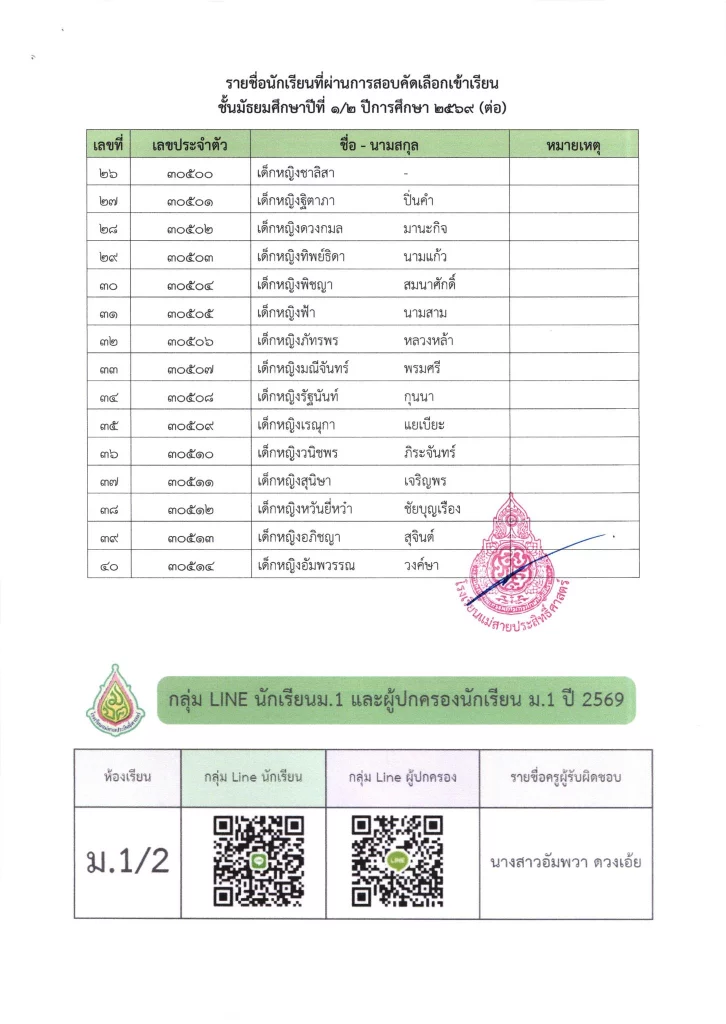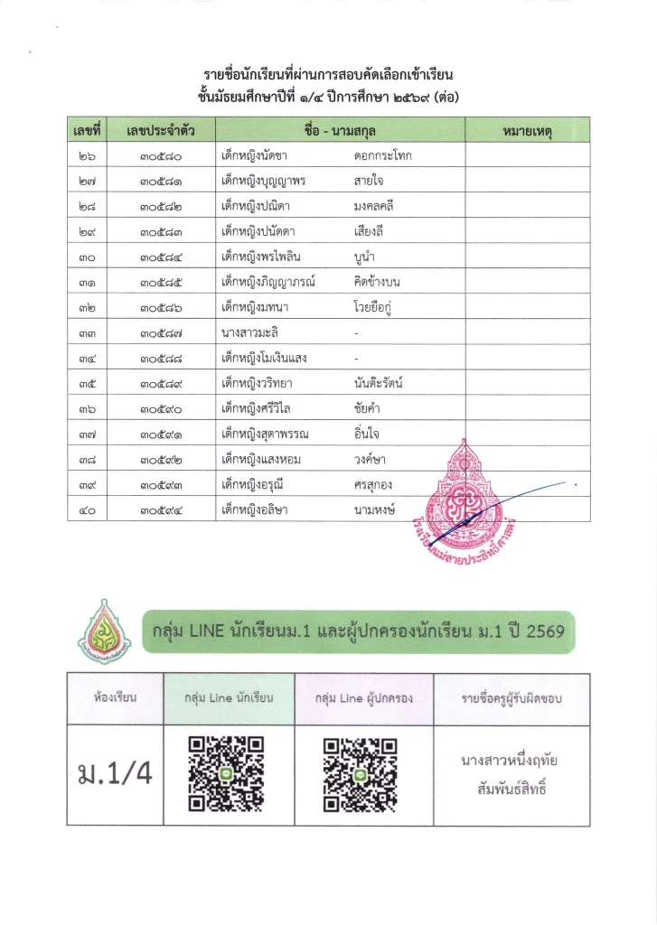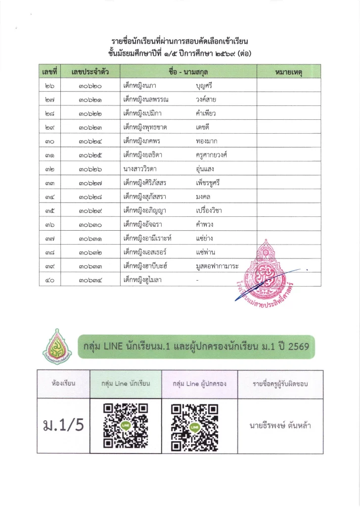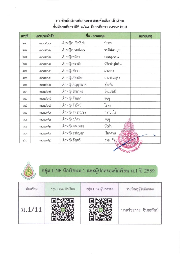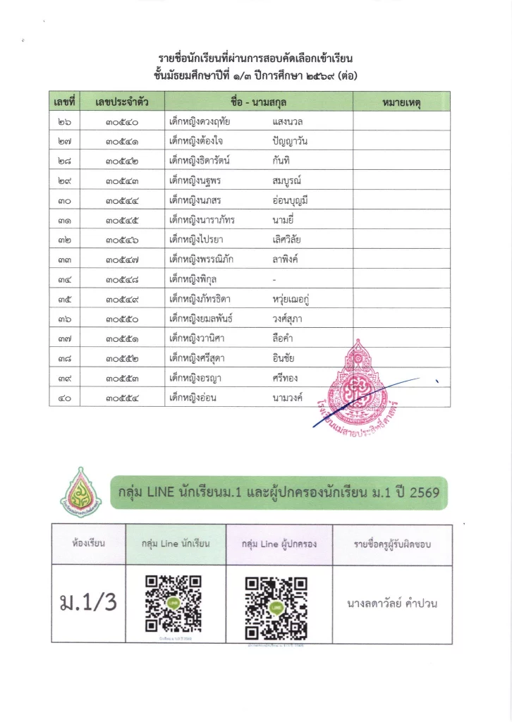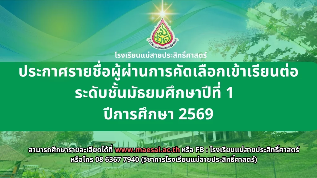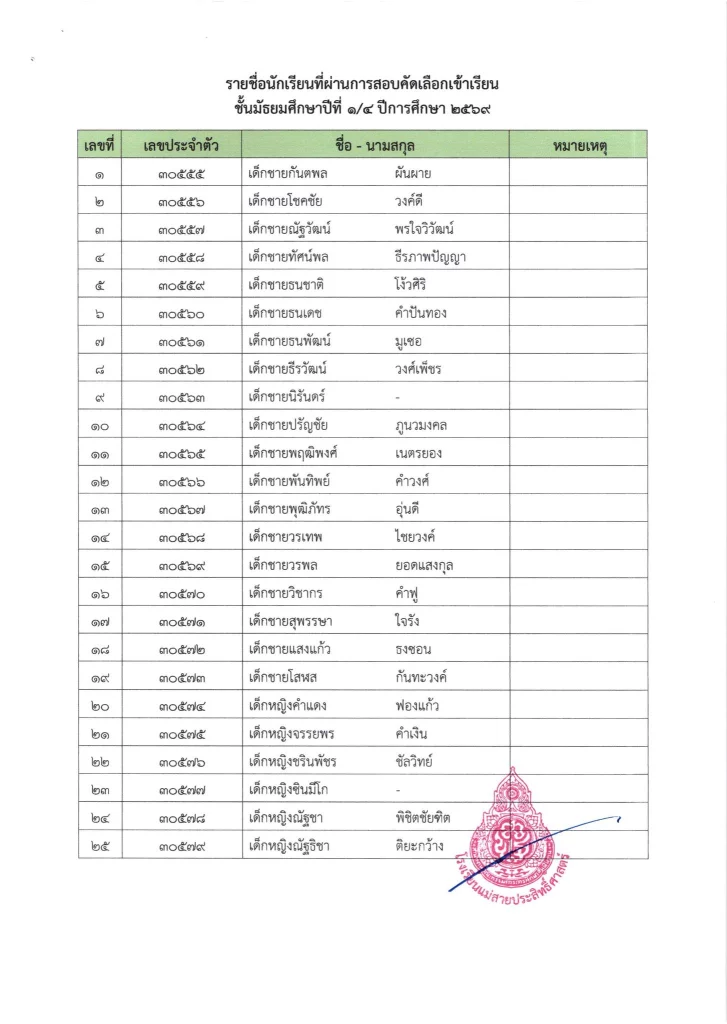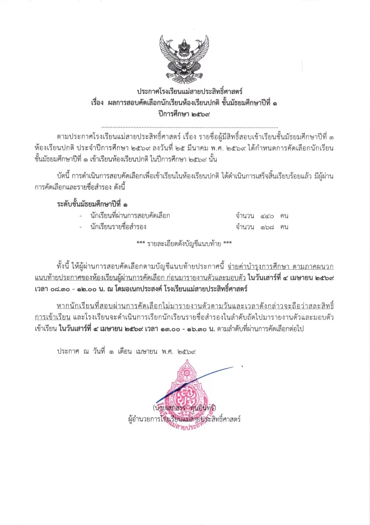 ประกาศ เรื่อง ผลการสอบคัดเลือกนักเรียนห้องเรียนปกติ มัธยมศึกษาปีที่ 1 ปีการศึกษา 2569