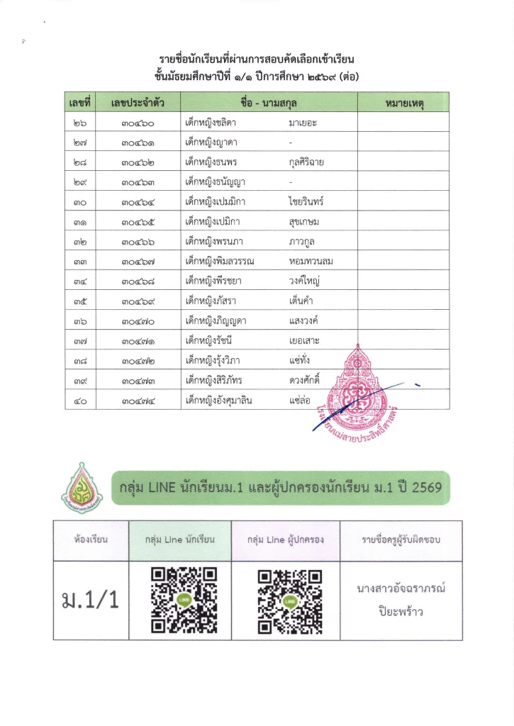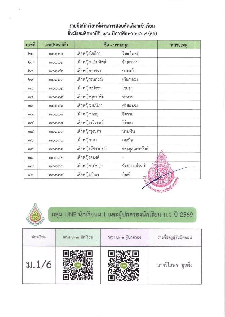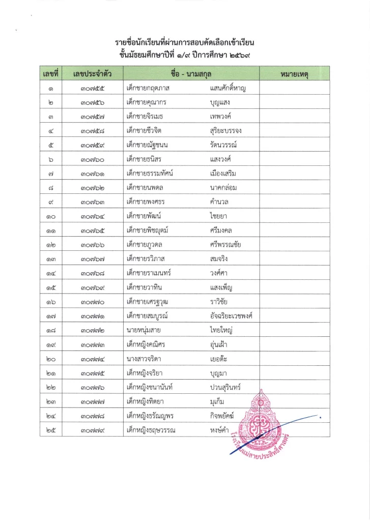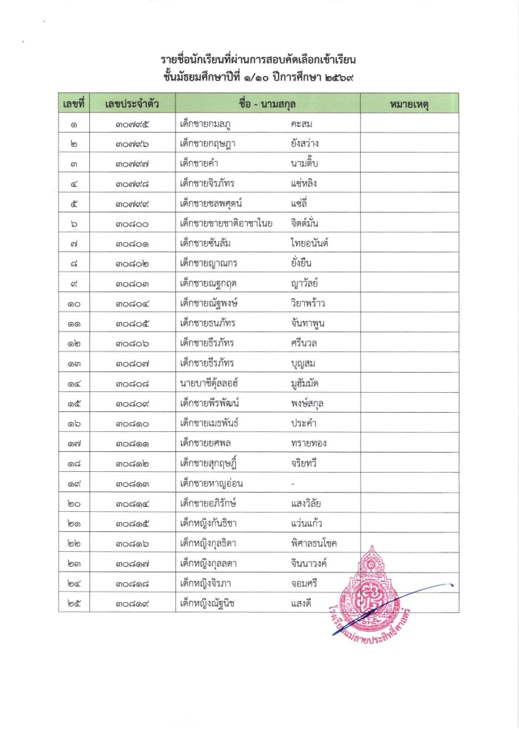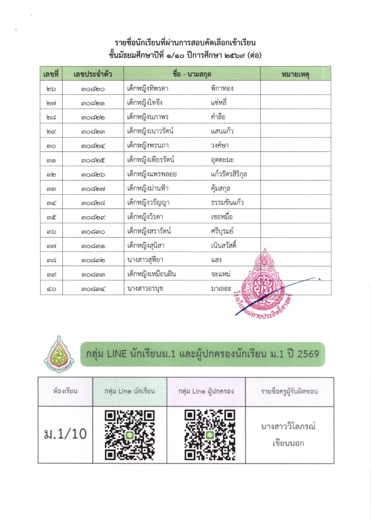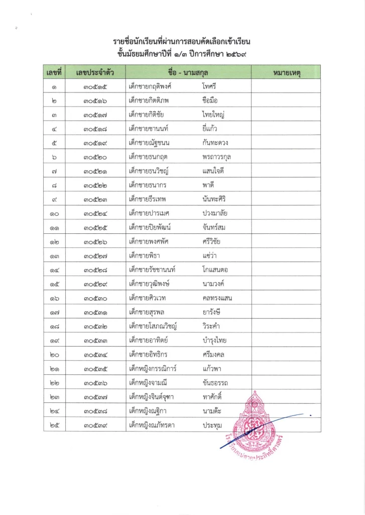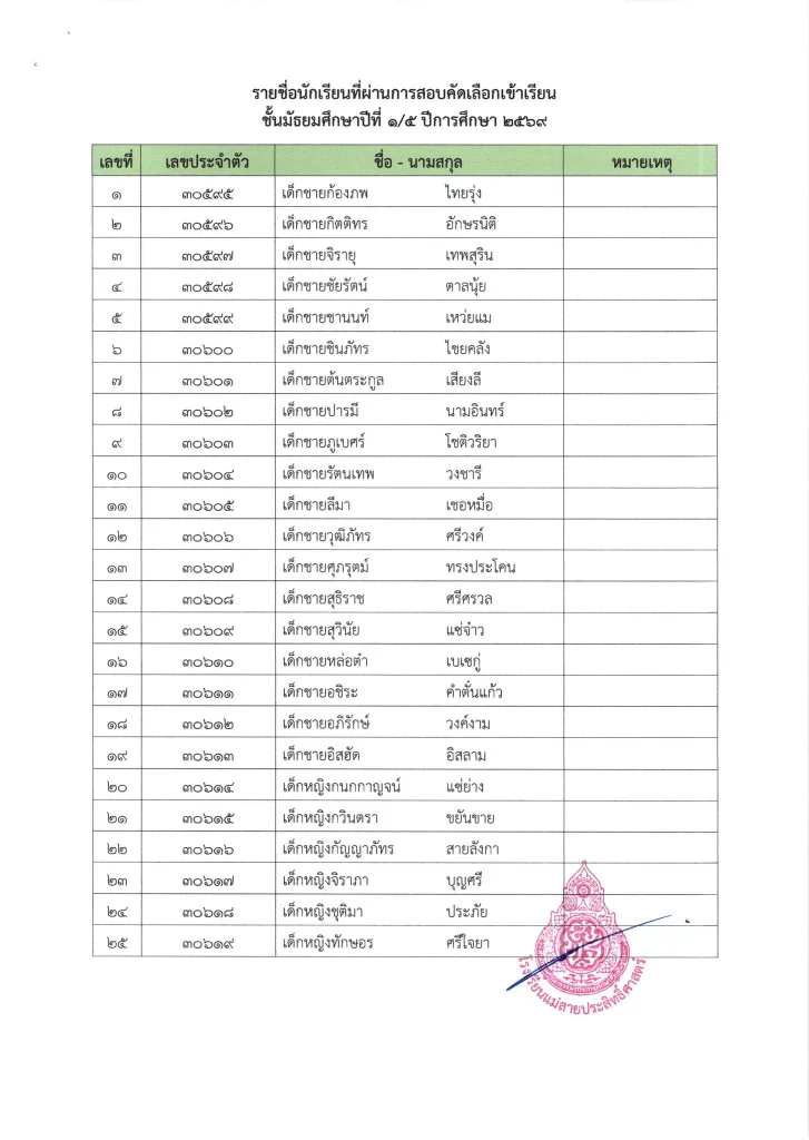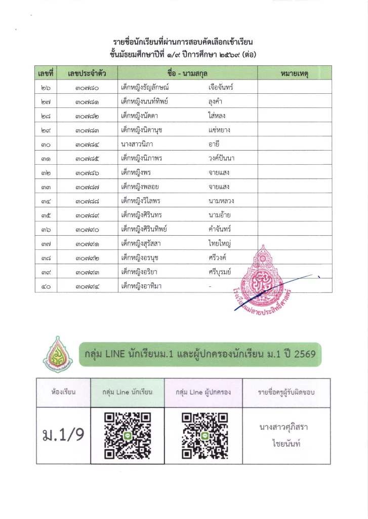 ประกาศ เรื่อง ผลการสอบคัดเลือกนักเรียนห้องเรียนปกติ มัธยมศึกษาปีที่ 1 ปีการศึกษา 2569