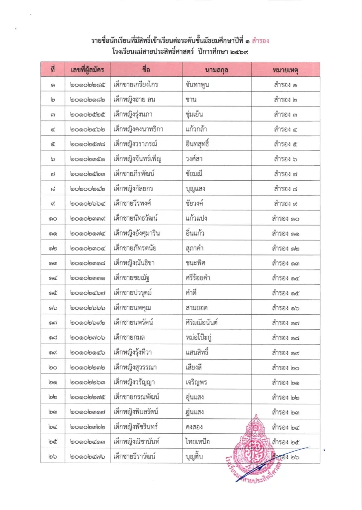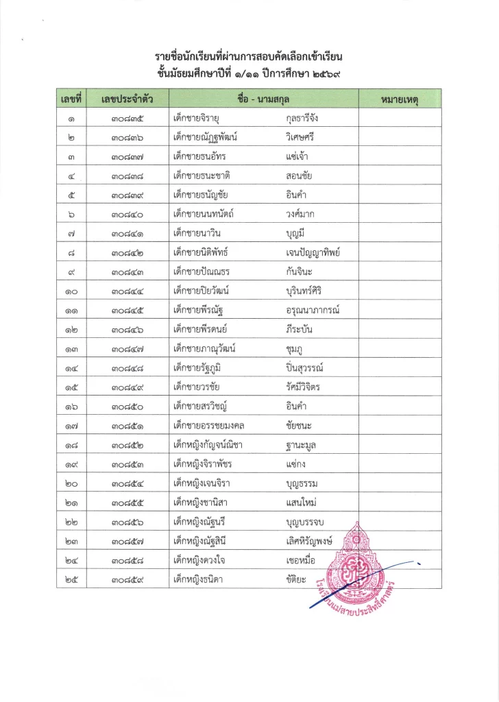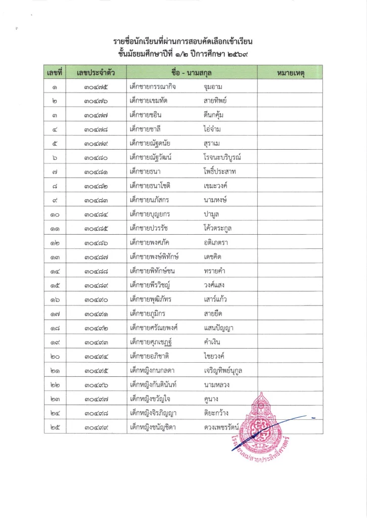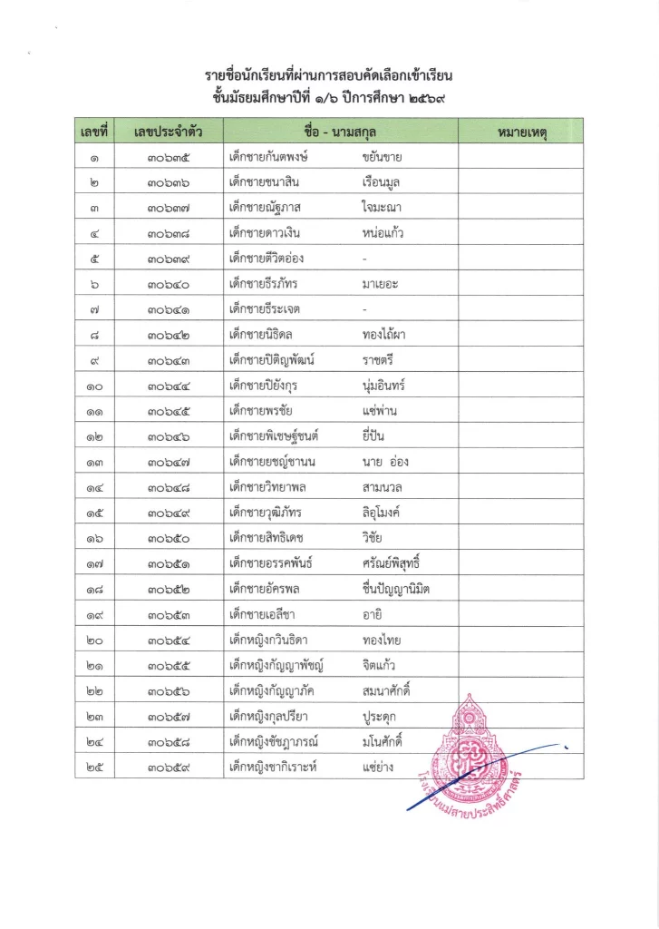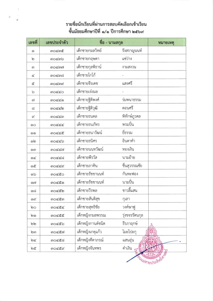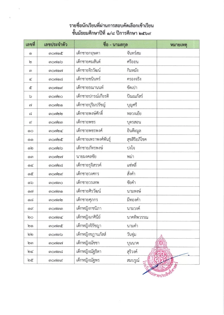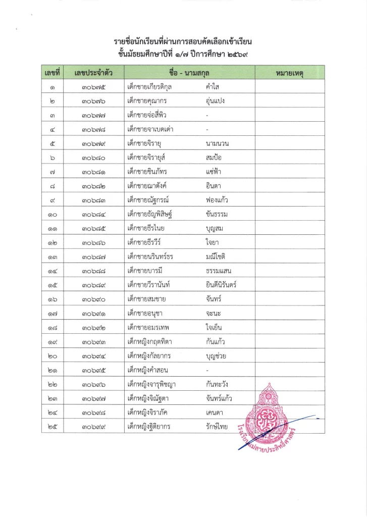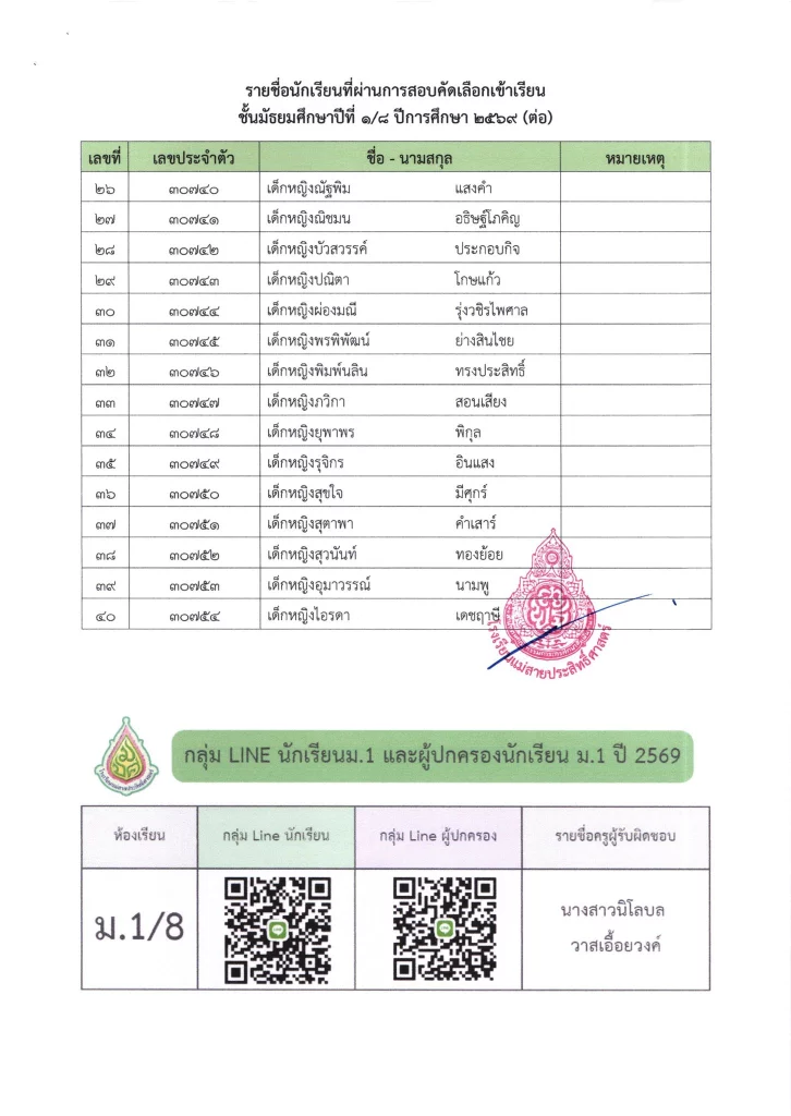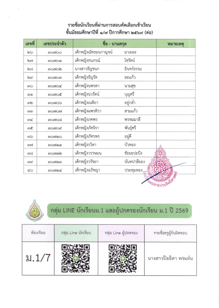 ประกาศ เรื่อง ผลการสอบคัดเลือกนักเรียนห้องเรียนปกติ มัธยมศึกษาปีที่ 1 ปีการศึกษา 2569