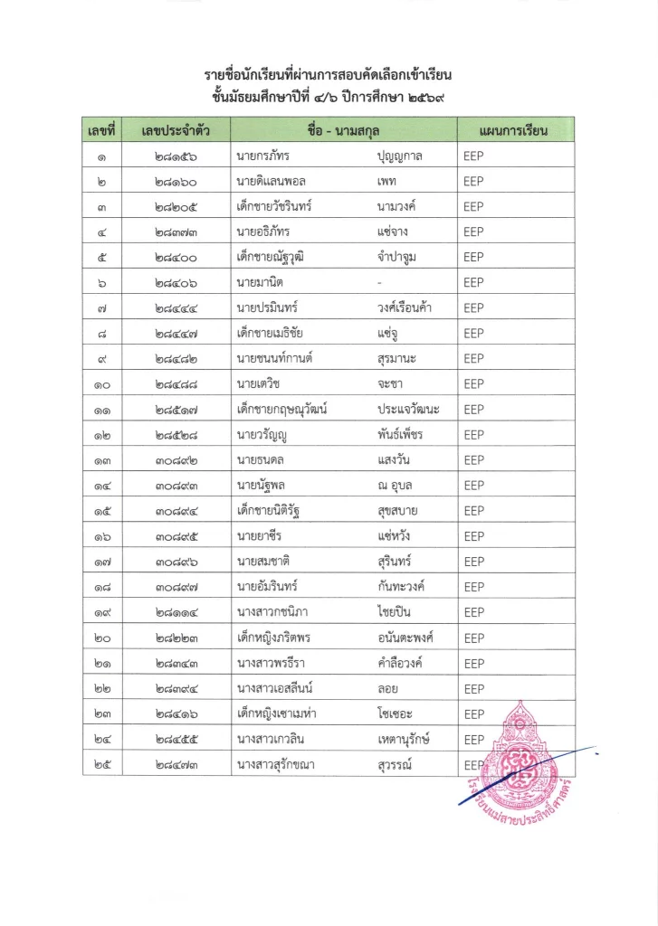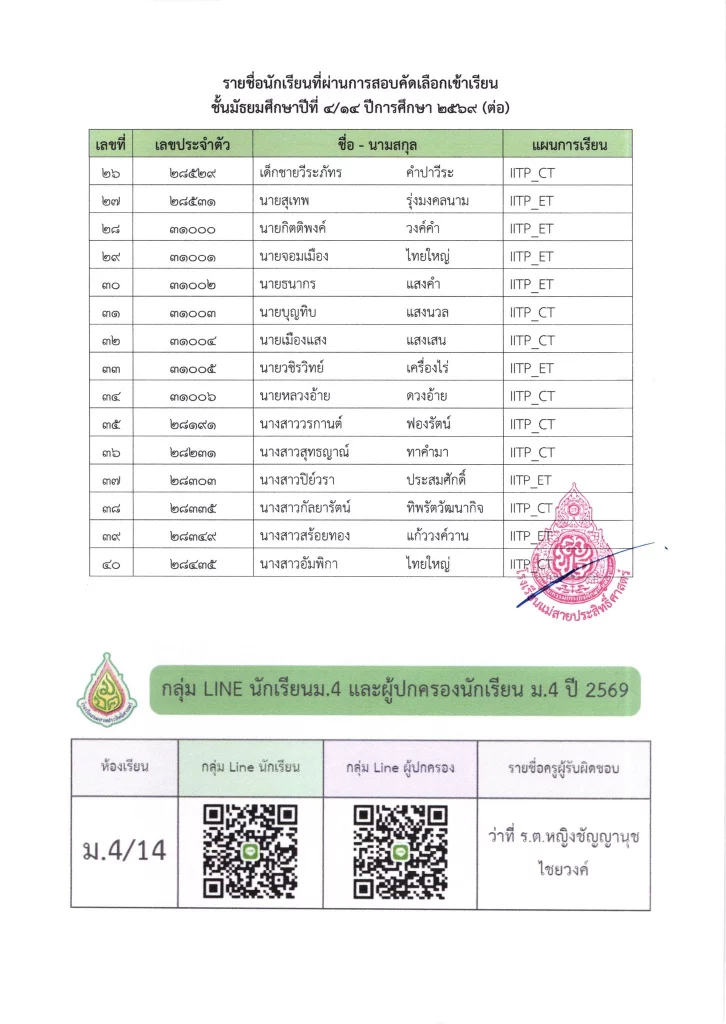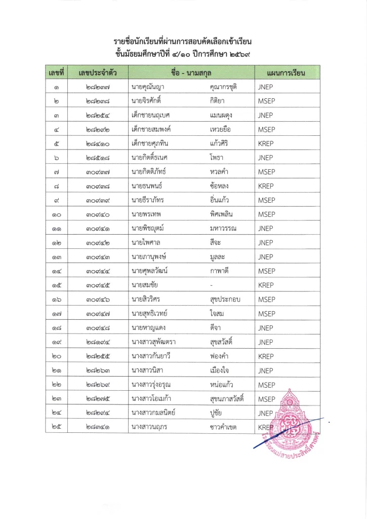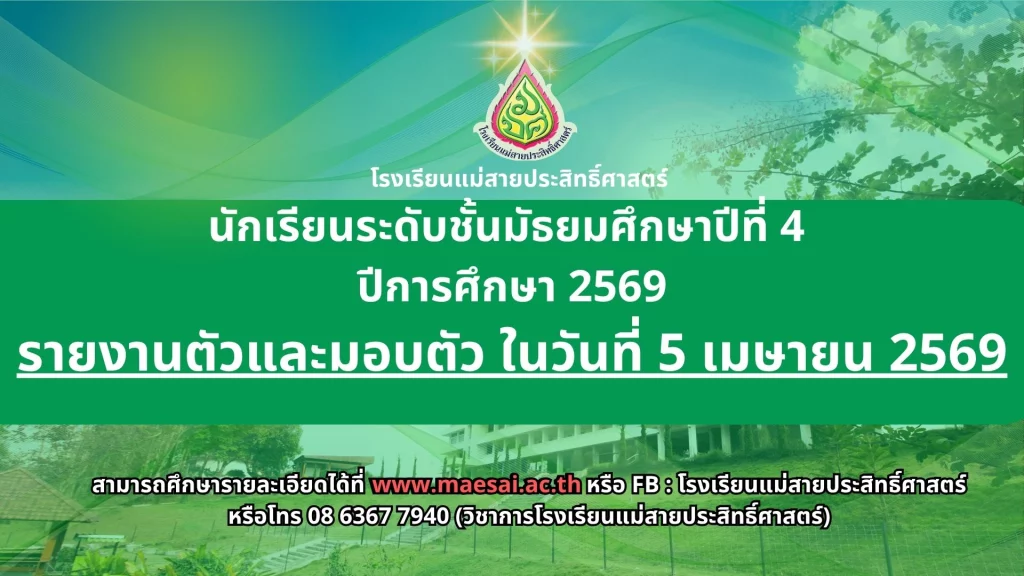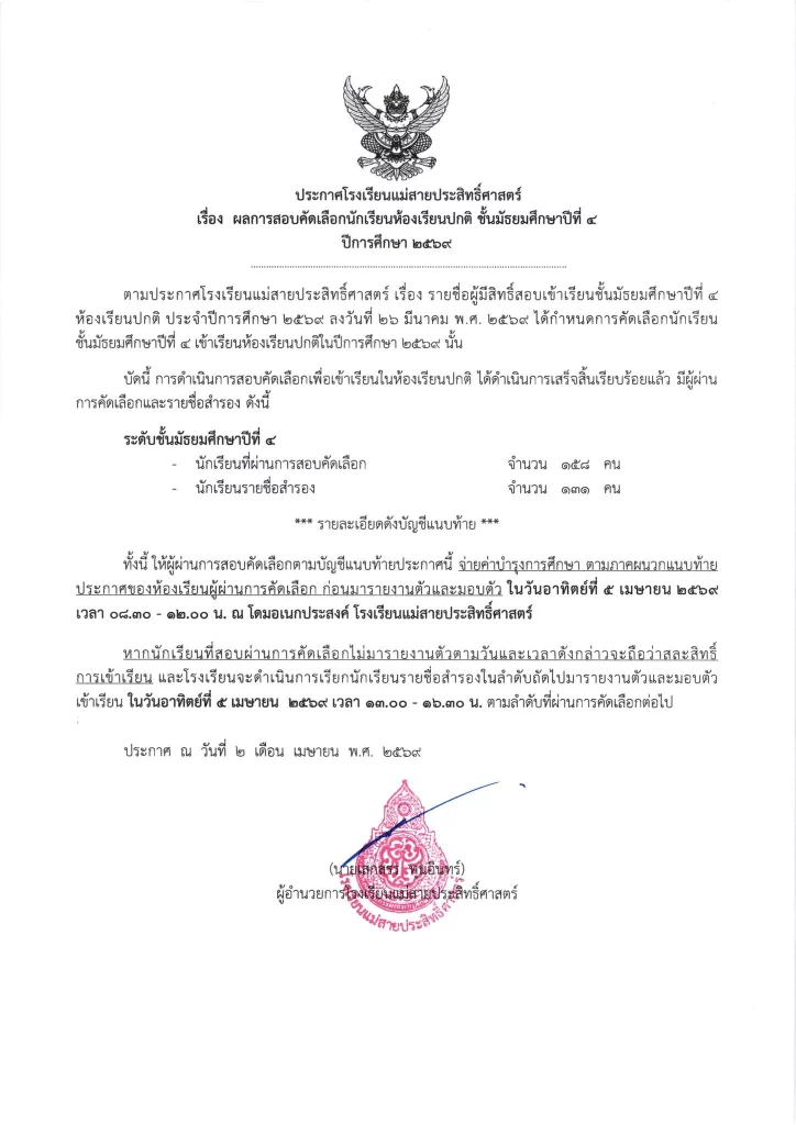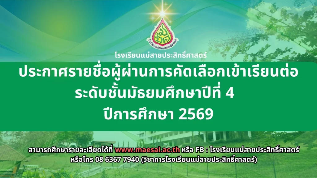 ประกาศ ประกาศ เรื่อง ผลการสอบคัดเลือกนักเรียนชั้นมัธยมศึกษาปีที่ 1 (ห้องปกติ) ตามโครงการเพชรแม่สาย ปีการศึกษา 256901/04/202601/04/2026