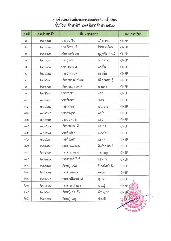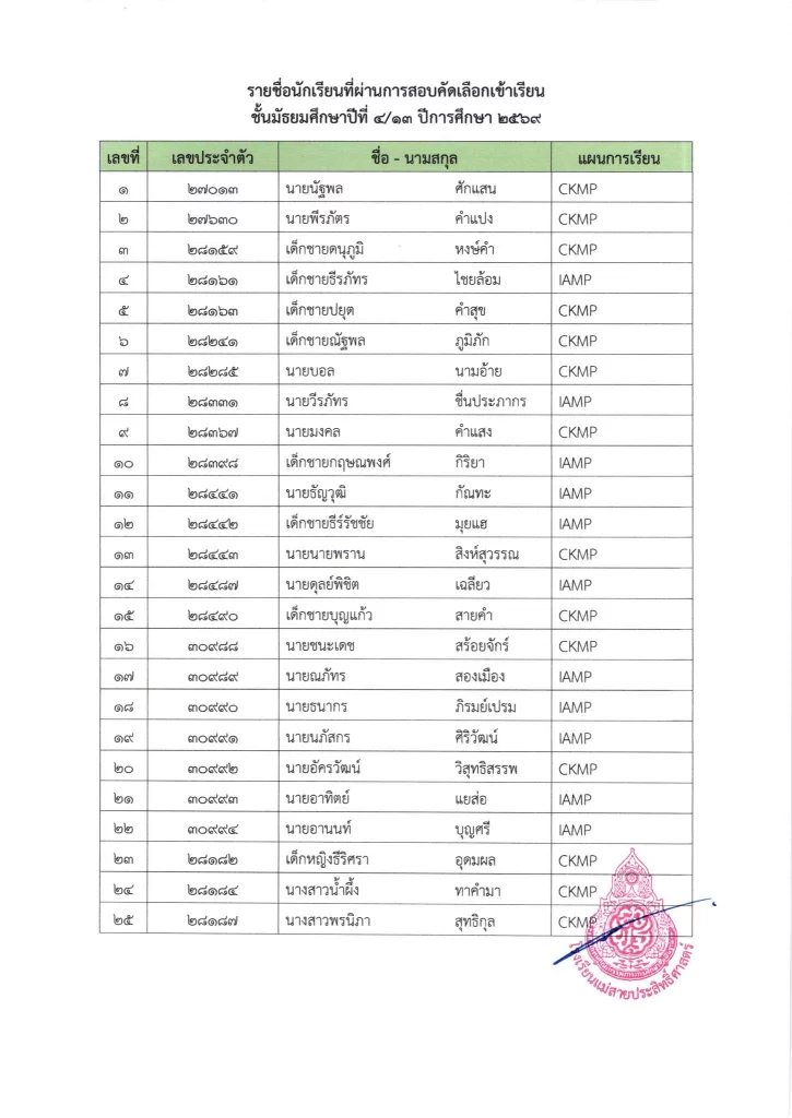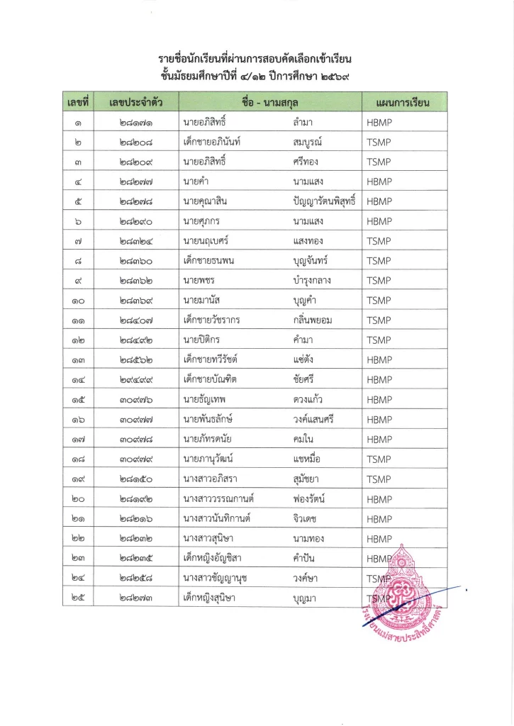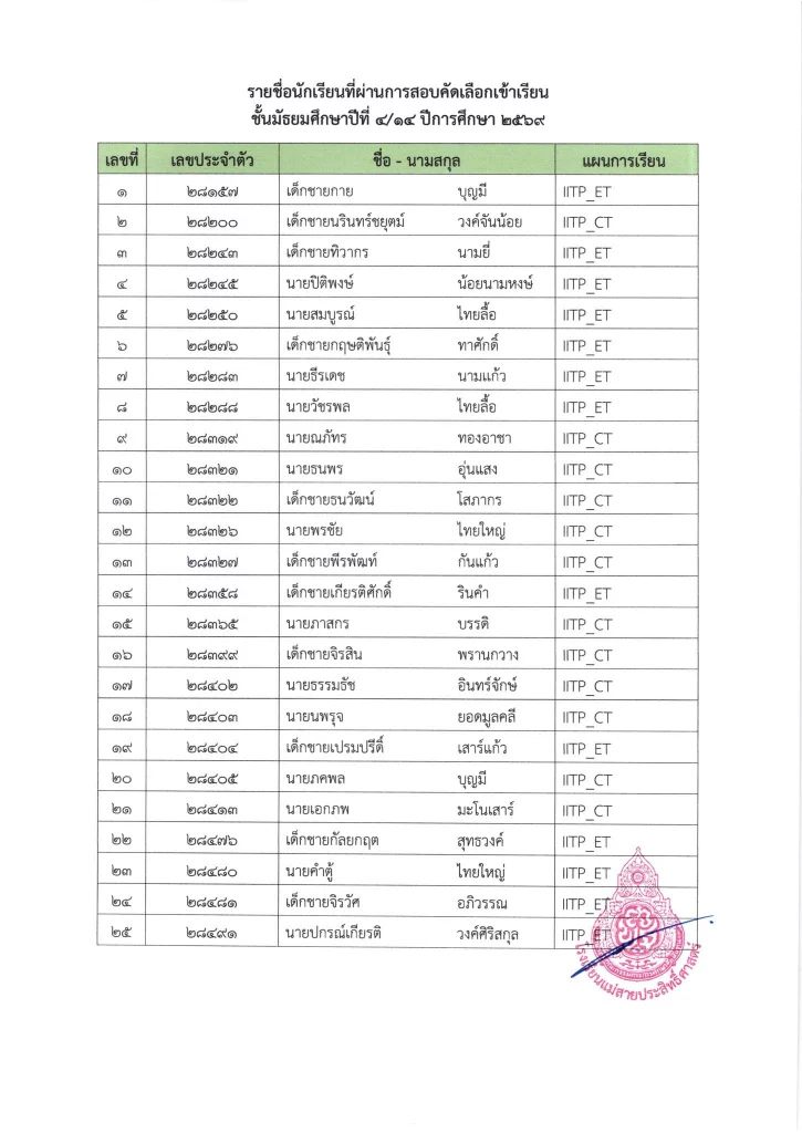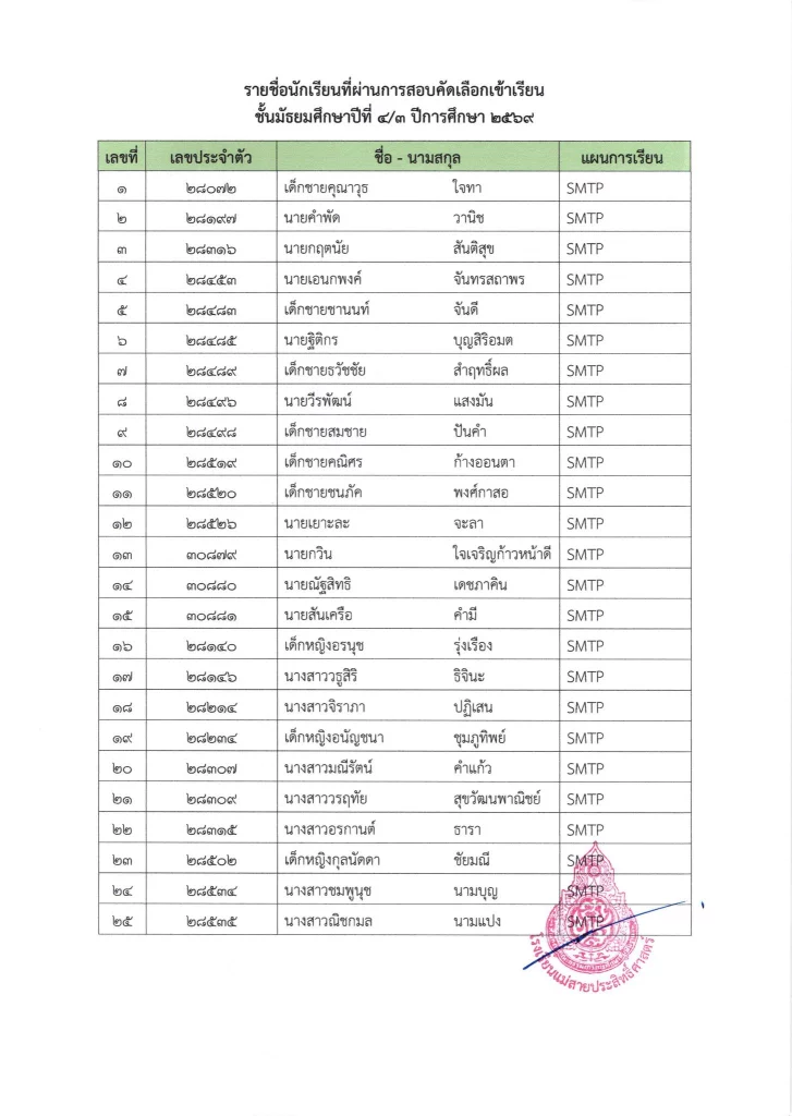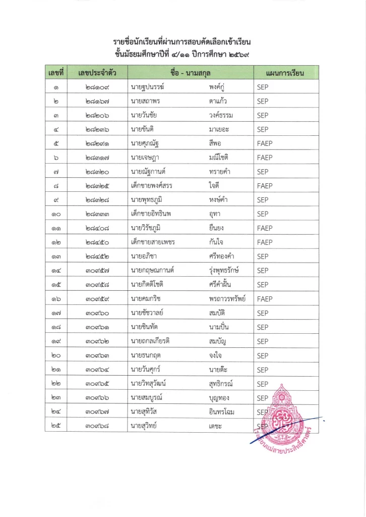 ประกาศ ประกาศ เรื่อง รายชื่อผู้มีสิทธิ์สอบเข้าเรียนชั้นมัธยมศึกษาปีที่ 1 ห้องเรียนปกติ ประจำปีการศึกษา 256925/03/202625/03/2026