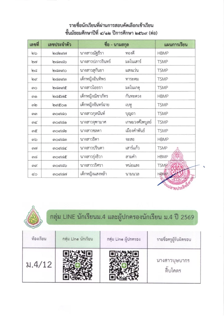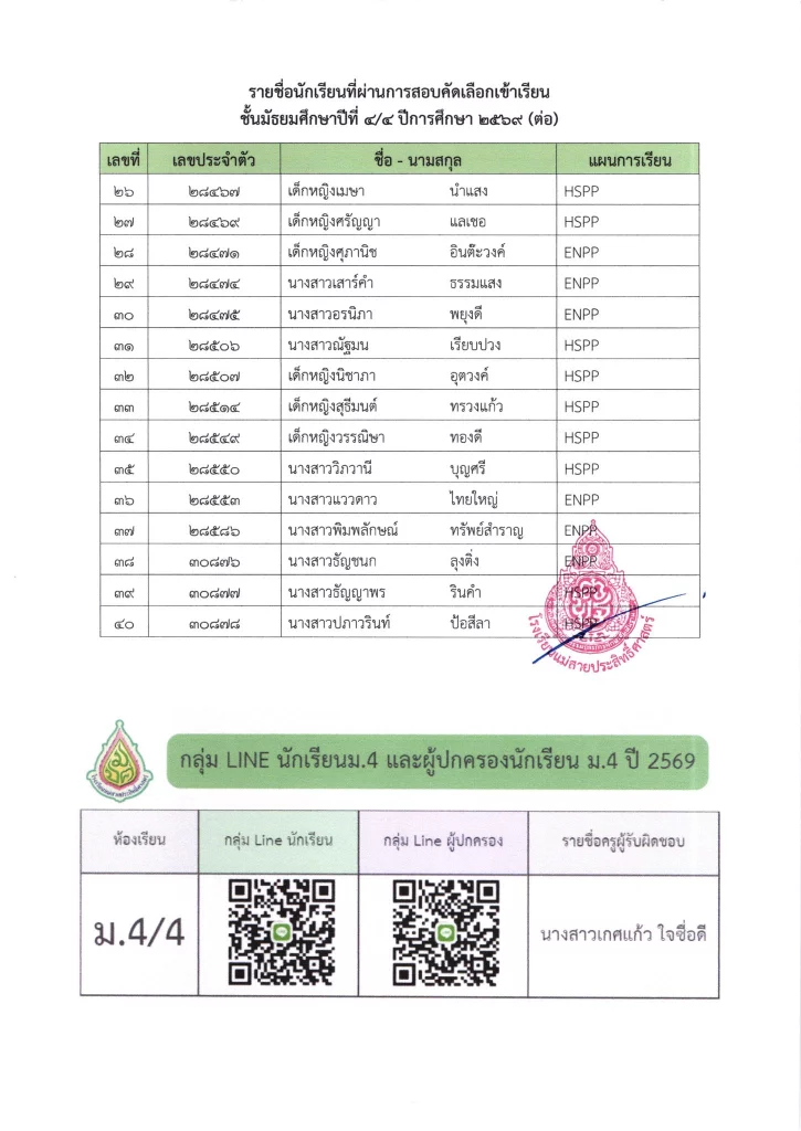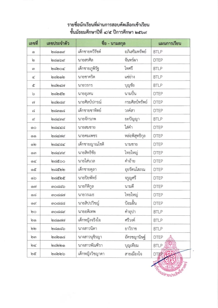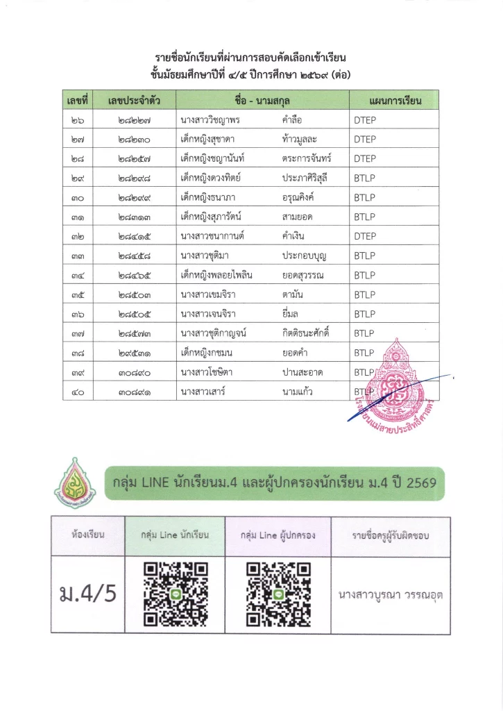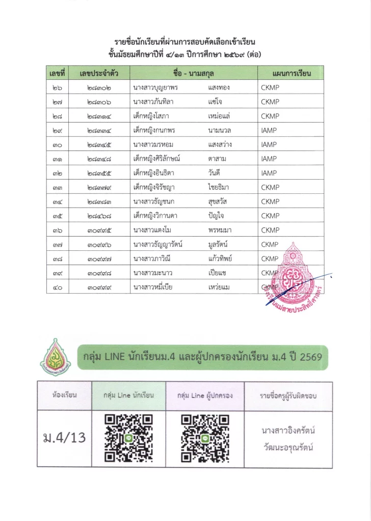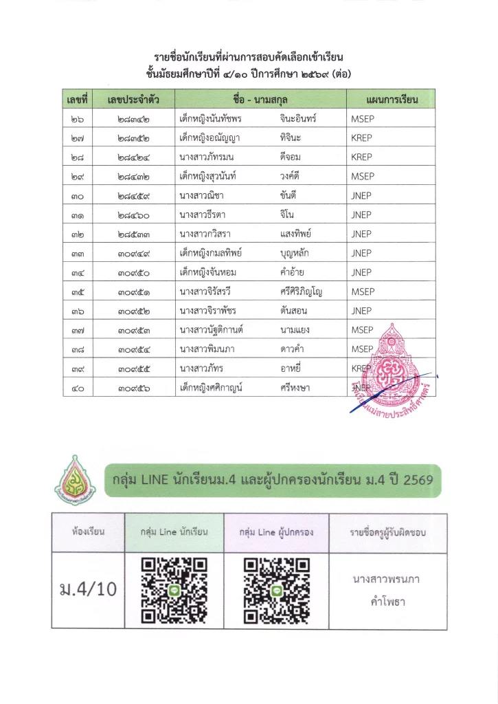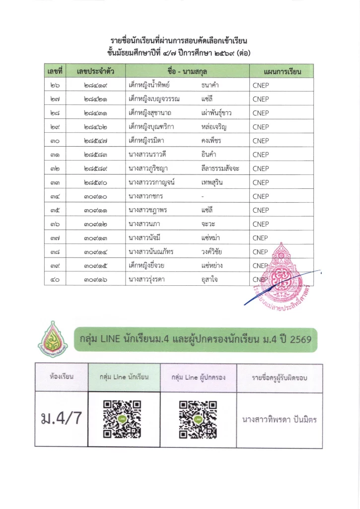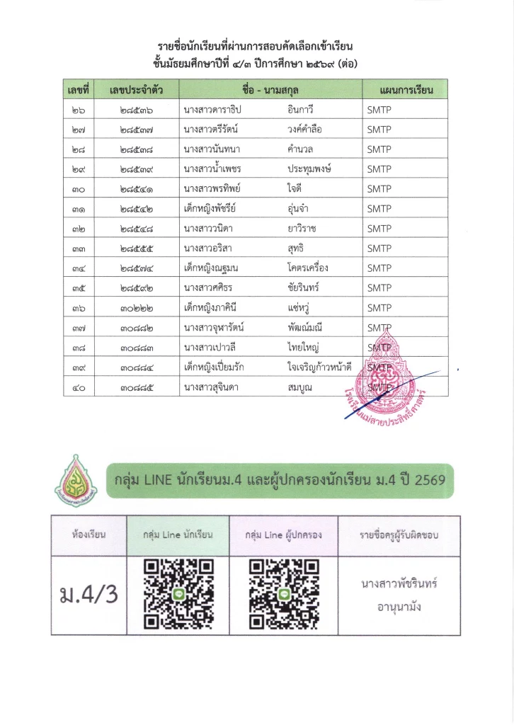 ประกาศ ประกาศ เรื่อง รายชื่อนักเรียนชั้นมัธยมศึกษาปีที่ 3 จากโรงเรียนเดิมที่มีศักยภาพเหมาะสม (โควตา) ที่มีสิทธิ์เข้าเรียนต่อชั้นมัธยมศึกษาปีที่ 4 ตามห้องเรียนที่เลือก ปีการศึกษา 256916/03/202616/03/2026