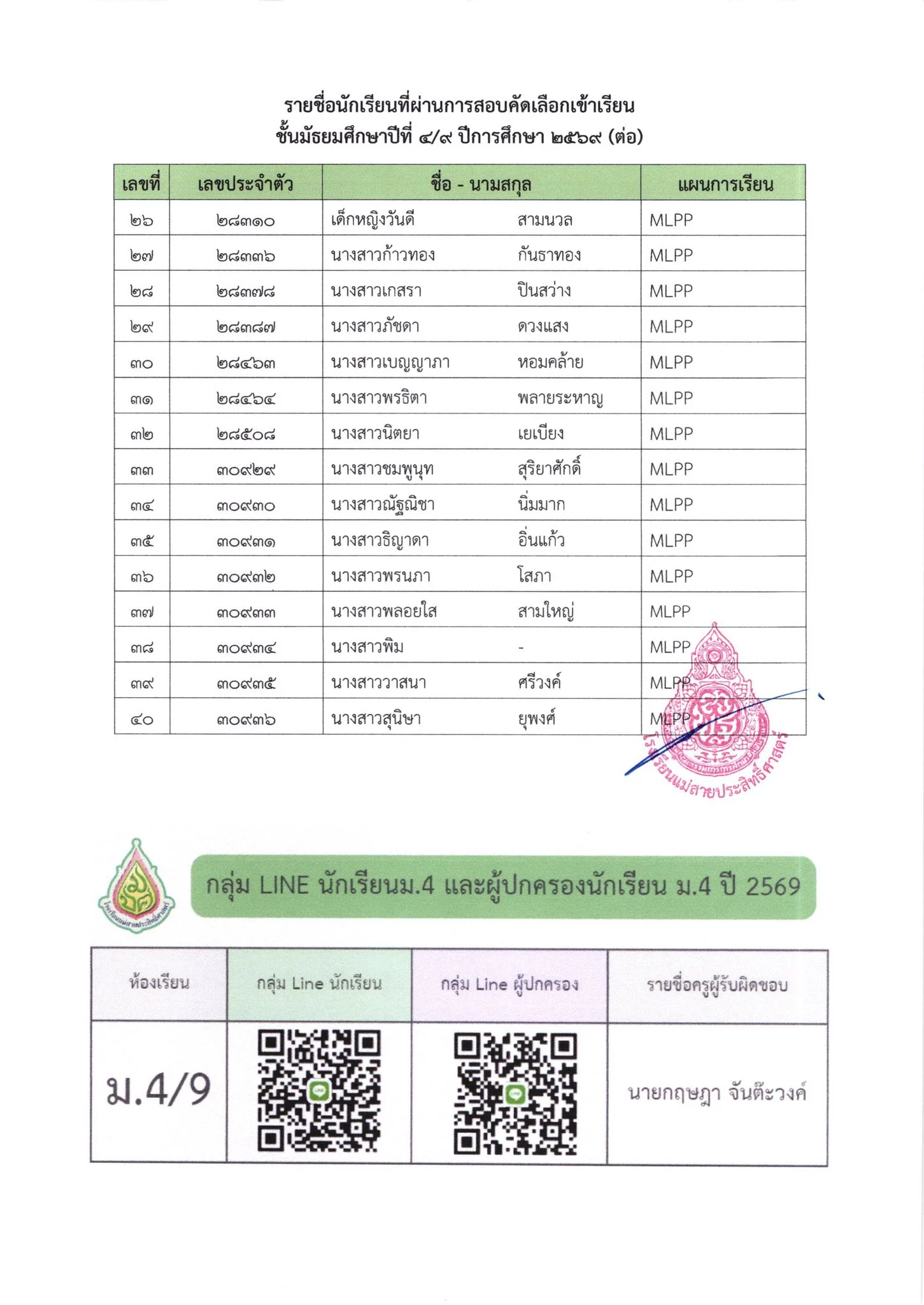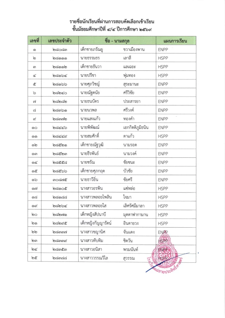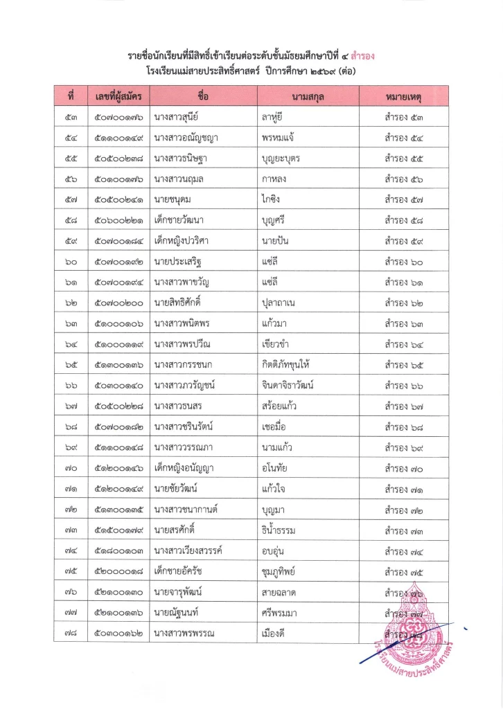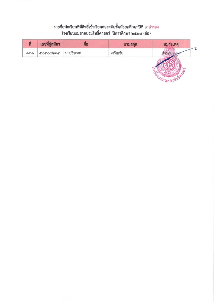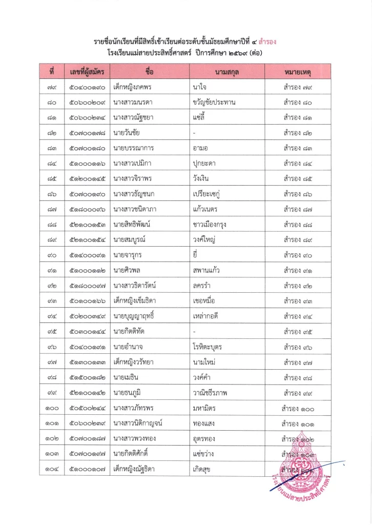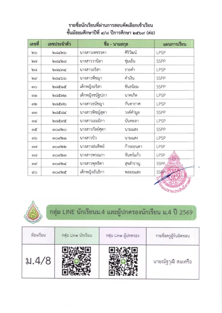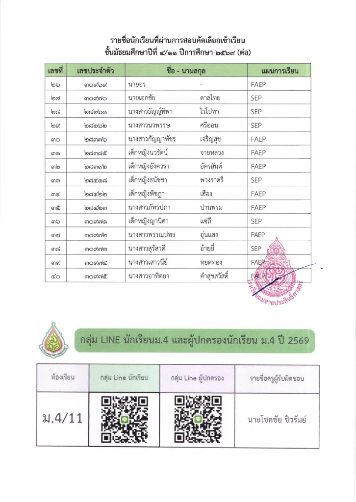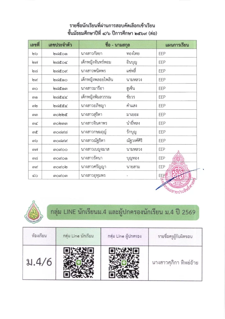 ประกาศ ประกาศ เรื่อง รายชื่อนักเรียนชั้นมัธยมศึกษาปีที่ 3 จากโรงเรียนเดิมที่มีศักยภาพเหมาะสม (โควตา) ที่มีสิทธิ์เข้าเรียนต่อชั้นมัธยมศึกษาปีที่ 4 ตามห้องเรียนที่เลือก ปีการศึกษา 256916/03/202616/03/2026