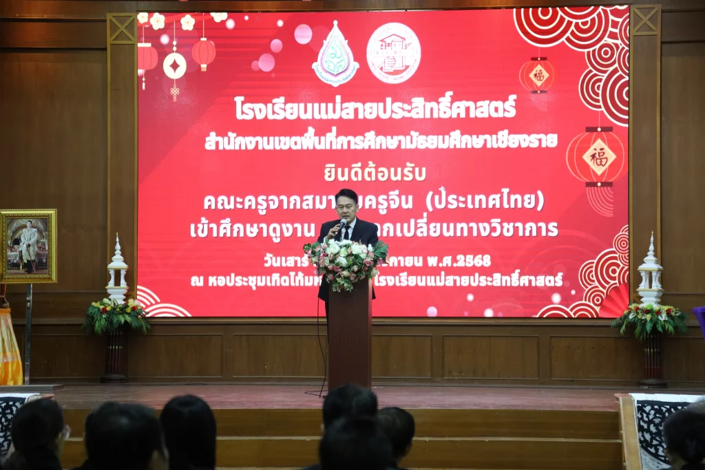 วันที่ ๒๙ พฤศจิกายน ๒๕๖๘ นายเสกสรร ทุนอินทร์ ผู้อำนวยการโรงเรียนแม่สายประสิทธิ์ศาสตร์ประสิทธิ์ พร้อมด้วยคณะผู้บริหาร และคณะครูกลุ่มสาระการเรียนรู้ภาษาต่างประเทศ ๒ ให้การต้อนรับ นายเกรียงศักดิ์ ยอดสาร ผู้อำนวยการสำนักงานเขตพื้นที่การศึกษามัธยมศึกษาเชียงราย และคณะครูจากสมาคมจีน (ประเทศไทย) เข้าศึกษาดูงานและแลกเปลี่ยนทางวิชาการ ณ หอประชุมเทิดไท้มหาราชินี โรงเรียนแม่สายประสิทธิศาสตร์ สำนักงานเขตพื้นที่การศึกษามัธยมศึกษาเชียงราย