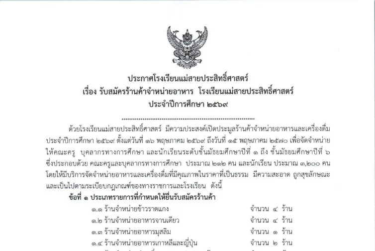 โรงเรียนแม่สายประสิทธิ์ศาสตร์ ประกาศรับสมัครร้านค้าจำหน่ายอาหาร ประจำปีการศึกษา 2569