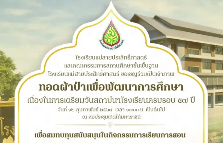 โรงเรียนแม่สายประสิทธิ์ศาสตร์ ขอเชิญร่วมเป็นเจ้าภาพทอดผ้าป่าเพื่อการศึกษา เนื่องในโอกาสครบรอบ 57 ปี ระดมทุนพัฒนาการเรียนการสอน